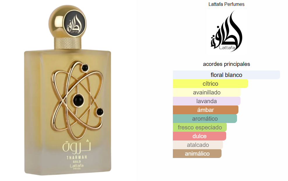 Tharwah Gold de Lattafa Perfumes es una fragancia femenina que se presenta como una alternativa económica al exclusivo Libre Intense de YSL. Su carácter combina una apertura dulce y vibrante con un corazón floral delicado y un fondo cálido y envolvente. Es un perfume alegre, sofisticado y sensual, diseñado para transmitir energía y elegancia en cada uso. Perfecto para quienes buscan una fragancia femenina con personalidad, versátil tanto para el día como para la noche.
