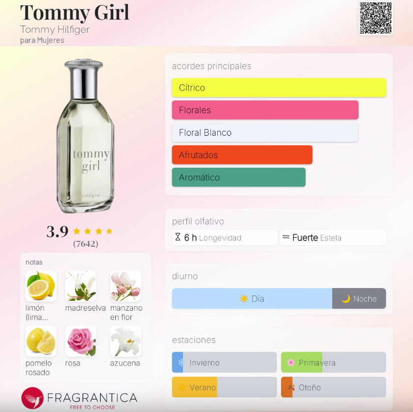 Tommy Girl de Tommy Hilfiger es una fragancia femenina lanzada en 1996, perteneciente a la familia Floral Frutal. Creada por la perfumista Calice Becker, es un perfume fresco, juvenil y lleno de energía, inspirado en el espíritu libre y optimista de la mujer americana. Su salida combina flores suaves y frutas brillantes que aportan luminosidad inmediata. En el corazón, las notas cítricas y florales se mezclan para crear un aroma limpio, vibrante y muy femenino. Finalmente, su fondo de maderas suaves y flores blancas deja una estela ligera, natural y encantadora.