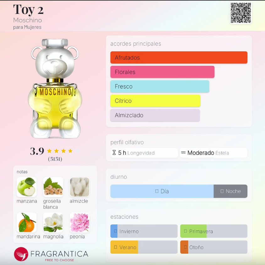 Toy 2 de Moschino es una fragancia femenina lanzada en 2018, perteneciente a la familia Almizcle Floral Amaderado. Creada por los perfumistas Alberto Morillas y Fabrice Pellegrin, es un perfume fresco, limpio y luminoso, con una estética divertida y moderna característica de la marca. Su salida combina notas frutales brillantes como la manzana y la mandarina, junto con un toque floral de magnolia. En el corazón, la grosella blanca, la peonía y el jazmín aportan suavidad, feminidad y un aire juvenil. Finalmente, su fondo de almizcle, sándalo y Amberwood crea una estela delicada, pulida y muy elegante.