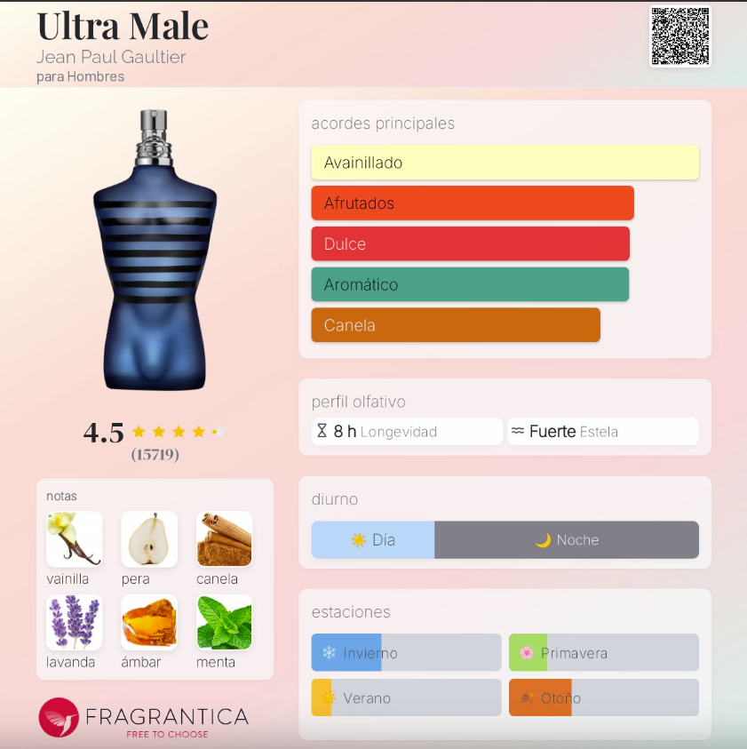 Ultra Male de Jean Paul Gaultier es una fragancia masculina lanzada en 2015, perteneciente a la familia Oriental Fougère. Creada por el prestigioso perfumista Francis Kurkdjian, es un perfume intenso, seductor y extremadamente adictivo que combina dulzor, frescura y especias. Su salida une pera, lavanda, menta, bergamota y limón, creando un inicio frutal, vibrante y fresco. En el corazón, la canela, la esclarea y la alcaravea aportan un toque especiado cálido y masculino. Finalmente, el fondo de vaina de vainilla negra, ámbar, pachulí y cedro deja una estela dulce, profunda y poderosa, característica de la línea Ultra.