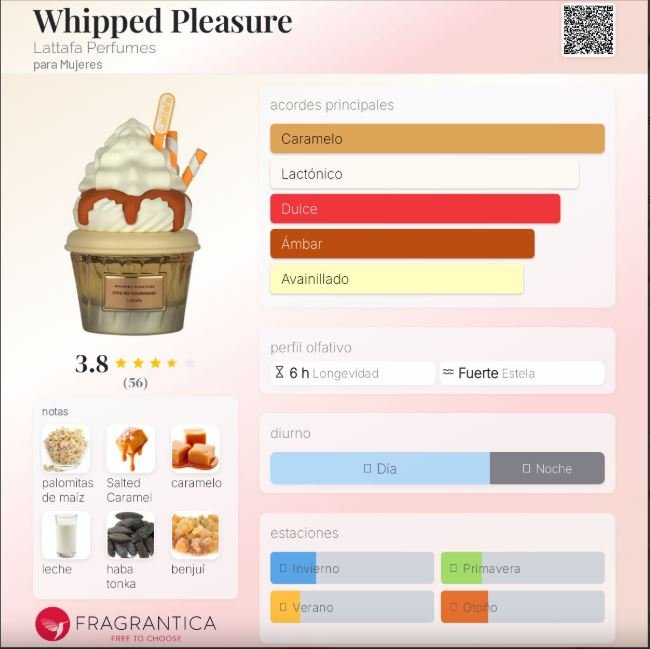 Whipped Pleasure de Lattafa Perfumes es una fragancia femenina lanzada en 2025, perteneciente a la familia Oriental Vainilla. Creada por la perfumista Nisrine Bouazzaoui Grillié, esta deliciosa composición gourmand combina notas dulces, cremosas y envolventes que evocan una experiencia sensorial de pura indulgencia. Su salida combina el aroma irresistible de palomitas de maíz con caramelo salado y toques de azúcar derretida. En el corazón, la leche y el jazmín añaden suavidad y equilibrio, mientras que el fondo de haba tonka, benjuí y almizcle crea una base cálida, sensual y adictiva. Es un perfume reconfortante, perfecto para los amantes de las fragancias dulces con carácter sofisticado.