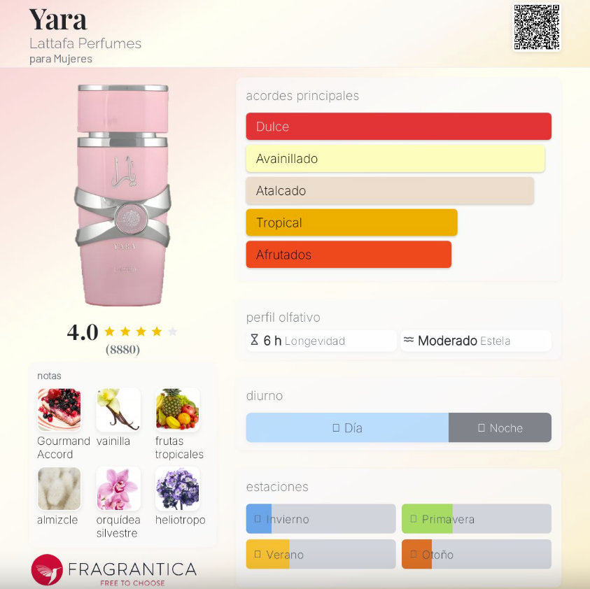 Yara de Lattafa Perfumes es una fragancia oriental vainilla lanzada en 2020. Su aroma es cremoso, femenino y envolvente, combinando flores suaves, un corazón goloso y un fondo cálido que la hace irresistiblemente adictiva. Es un perfume ideal para quienes aman los aromas dulces, tropicales y con una estela suave pero presente que acompaña perfecto el día a día.